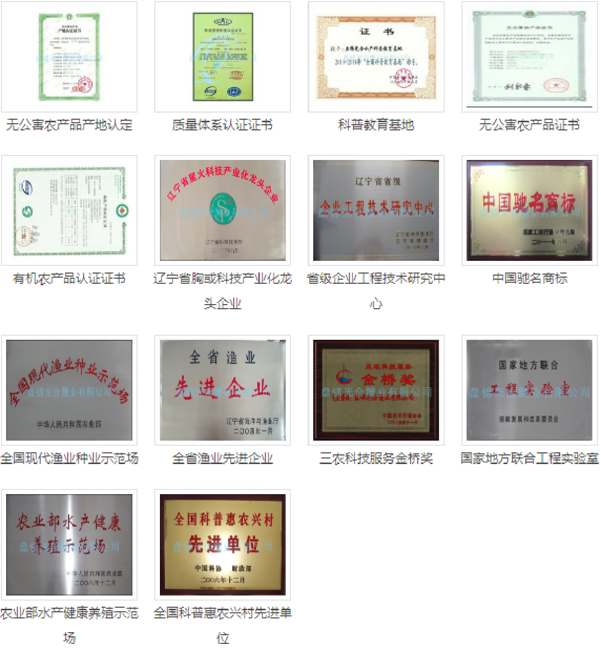 “东”牌盘锦河蟹系列被授予“盘锦名牌产品称号”;被评为辽宁十大诚信守法企业;中华绒螯蟹“光合1号”通过国家原良种审定委员会审定,成为我国第一个国家级河蟹新品种,品种登记号:GS-01-004-2011 2012年:李晓东董事长当选为中国共产党十八次全国代表大会代表;认定为“辽宁省中小企业技术服务平台;2012年10月,经农业部验收和审查,根据农渔发【2012】27号文件,我公司被批准为国家级河蟹良种场,命名为“辽宁盘锦中华绒螯蟹良种场”,并颁发了《验收合格证书》。11月16日,被国家发改委核准为“国家地方联合工程实验室平台”。11月23日,被评选为2011——2012年度全国“讲理想、比贡献”活动先进集体。