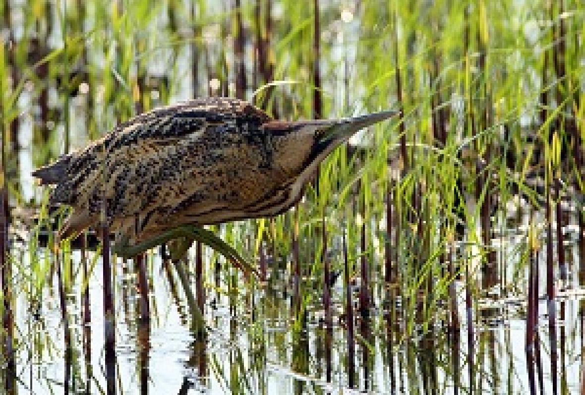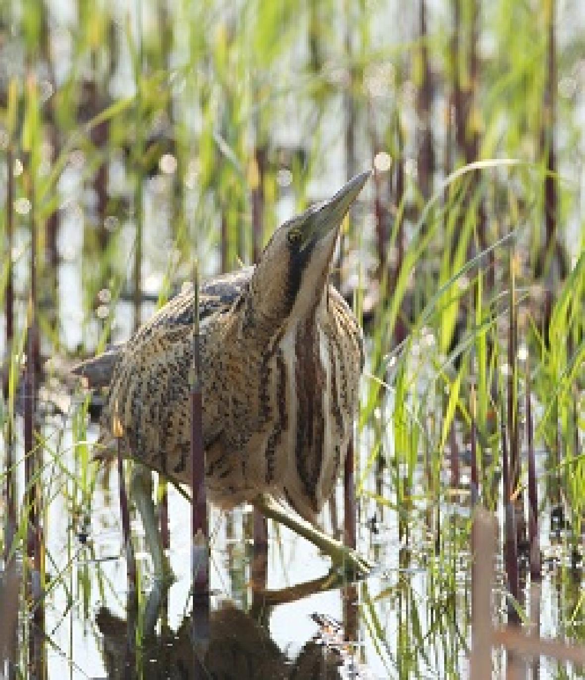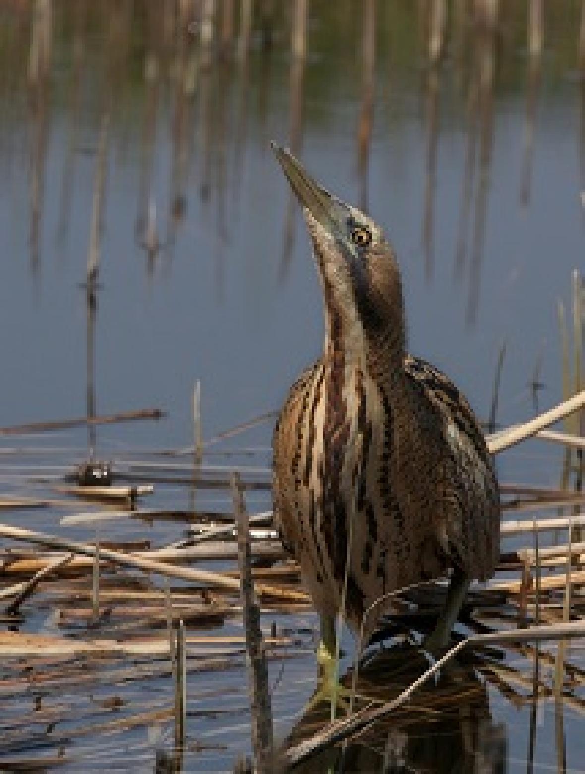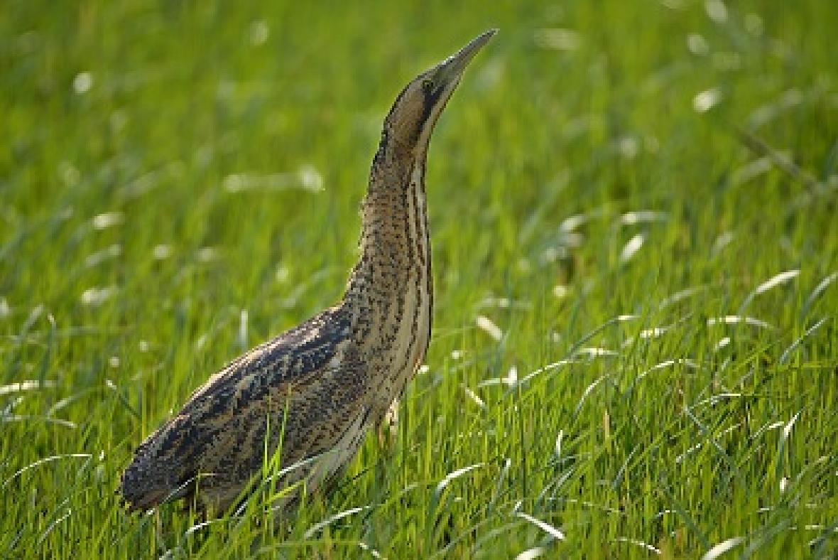 大麻鳽(学名:Botaurus stellaris),俗称:大水骆驼、蒲鸡、水母鸡、大麻鹭,是大型鹭类,体长59~77cm,全身为麻褐色,顶冠为黑褐色,头侧为金色,其余体羽多具黑色纵纹及杂斑。飞行时,具褐色横斑的飞羽与金色的覆羽及背部成对比。嘴为黄色,脚为绿黄色。看看这身行头,像不像草莽英雄——如果不仔细看,它们与枯草混在一起,加之它们懒得动,根本发现不了“目标”。这大概是它们自我保护的一种“策略”吧。