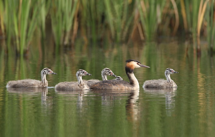 那天,在一条小河渠中看到一只凤头鷉,驮着两只幼雏在水中游弋,另两只稍大的小家伙像水中护卫,前后跟随。两只幼雏像“贴”在凤头妈妈背上一样——如果给它们一张相框,再取个名字,应该叫“依恋”。不远处,凤头爸爸嘴里叼着食物向它们游去。接近后,凤头爸爸将食物喂给凤头妈妈背上的小宝贝。然后转身,又去寻找新的食物去了。