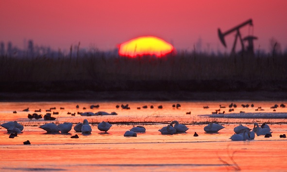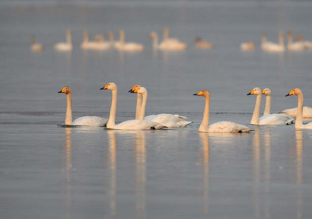 Every spring, the whooper Swan migrates to north from Rongcheng, Shandong, staying at the Liaohekou wetland for about a month, and then continue to fly to Inner Mongolia. They have safe conscious and collective concept, they rarely stay on land, but landed on the wider water surface of the reed,they will be together to take care of each other at rest time in the evening.They also pay special attention to democracy, before flying and landing,their "leader" will ask them for advice.